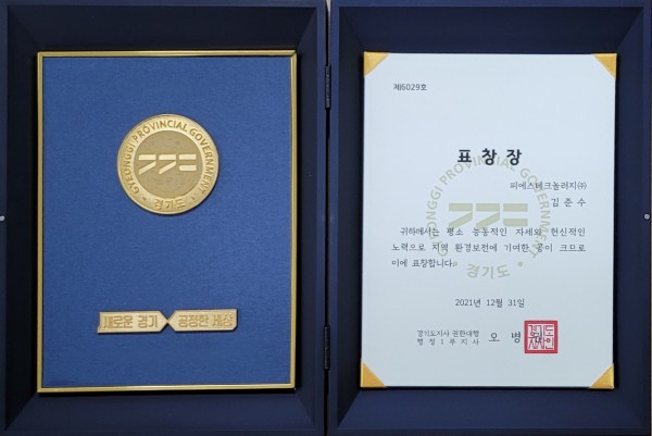 피에스테크놀러지(주) 김준수 대표는, 2022년 1월 5일 경기도지사로부터 환경부문의 유공자 표창을 수상하였습니다.